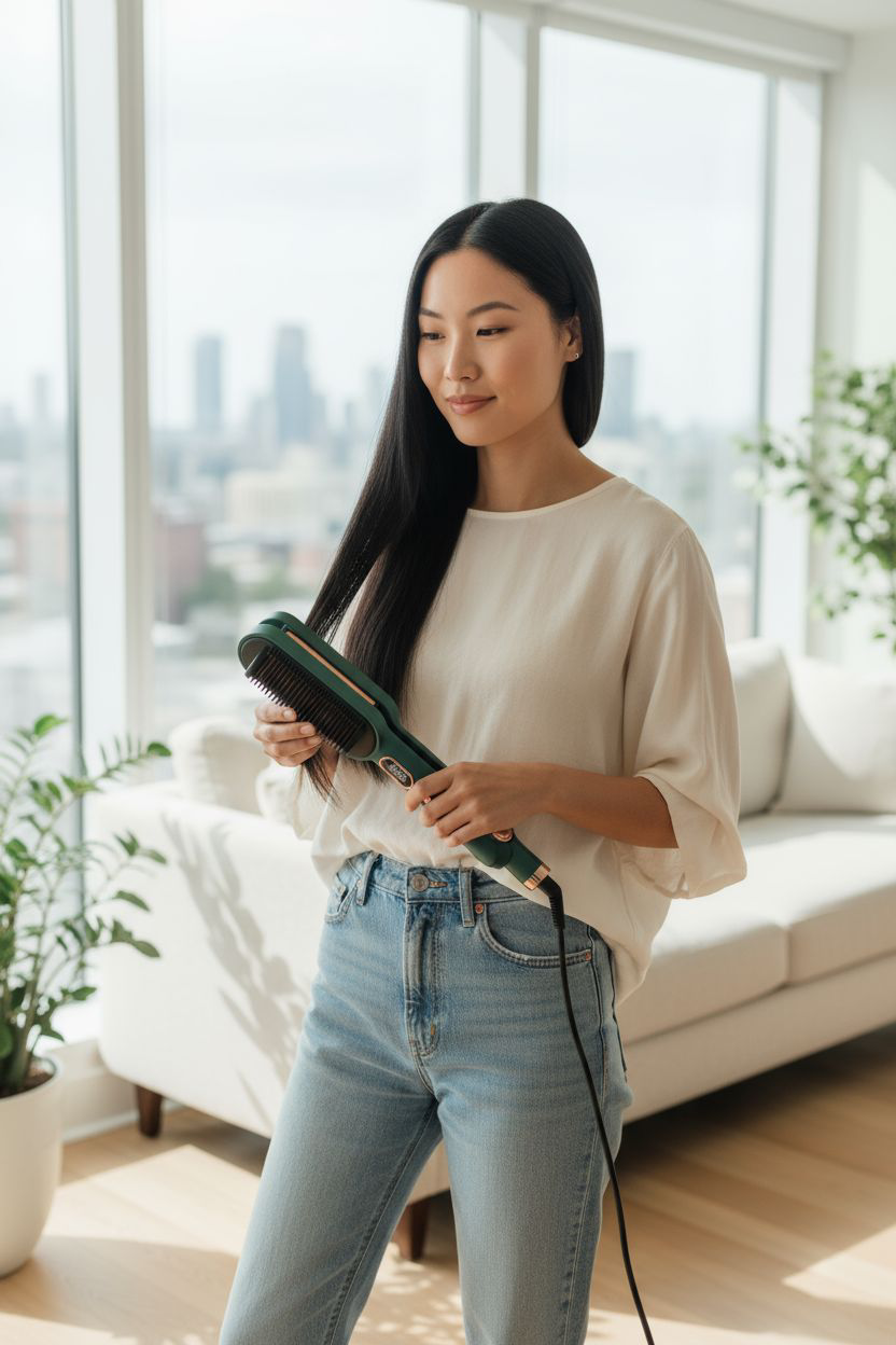 💚 Diseño 2 en 1: Combina plancha y cepillo térmico para lograr un alisado suave o unas ondas definidas con un solo movimiento.